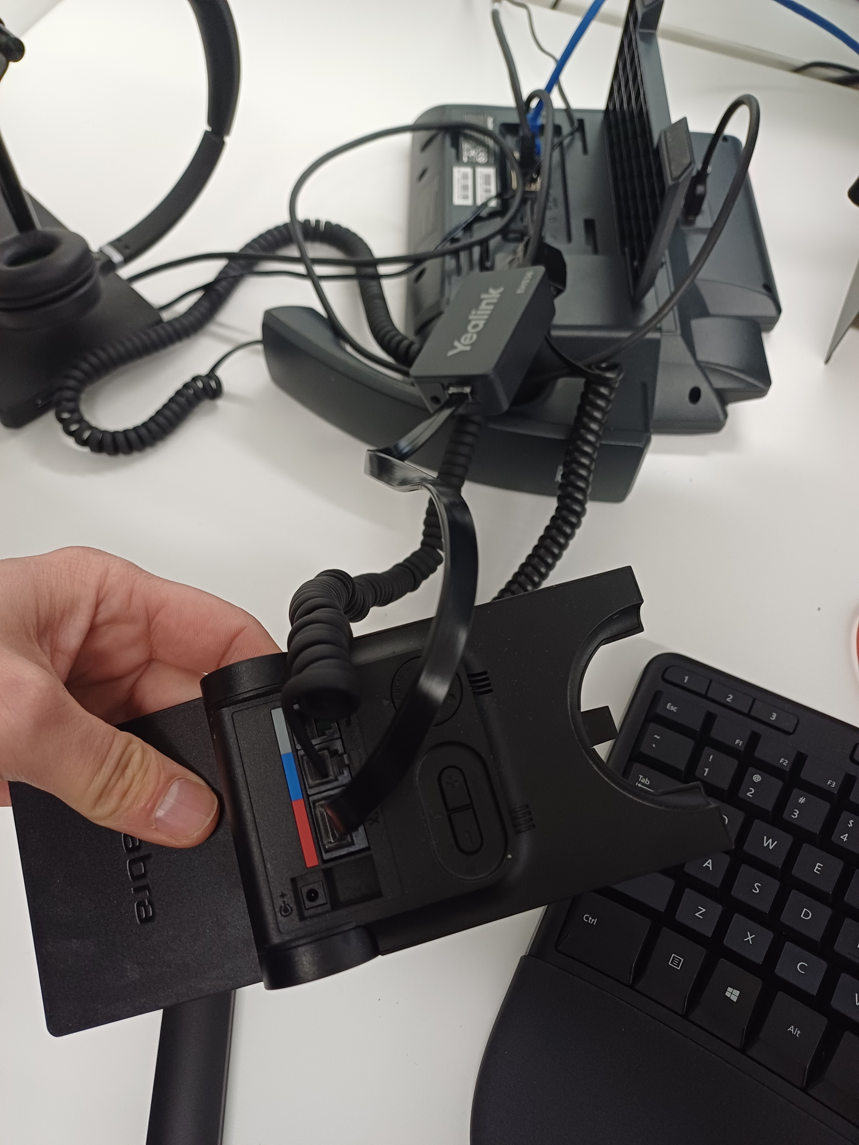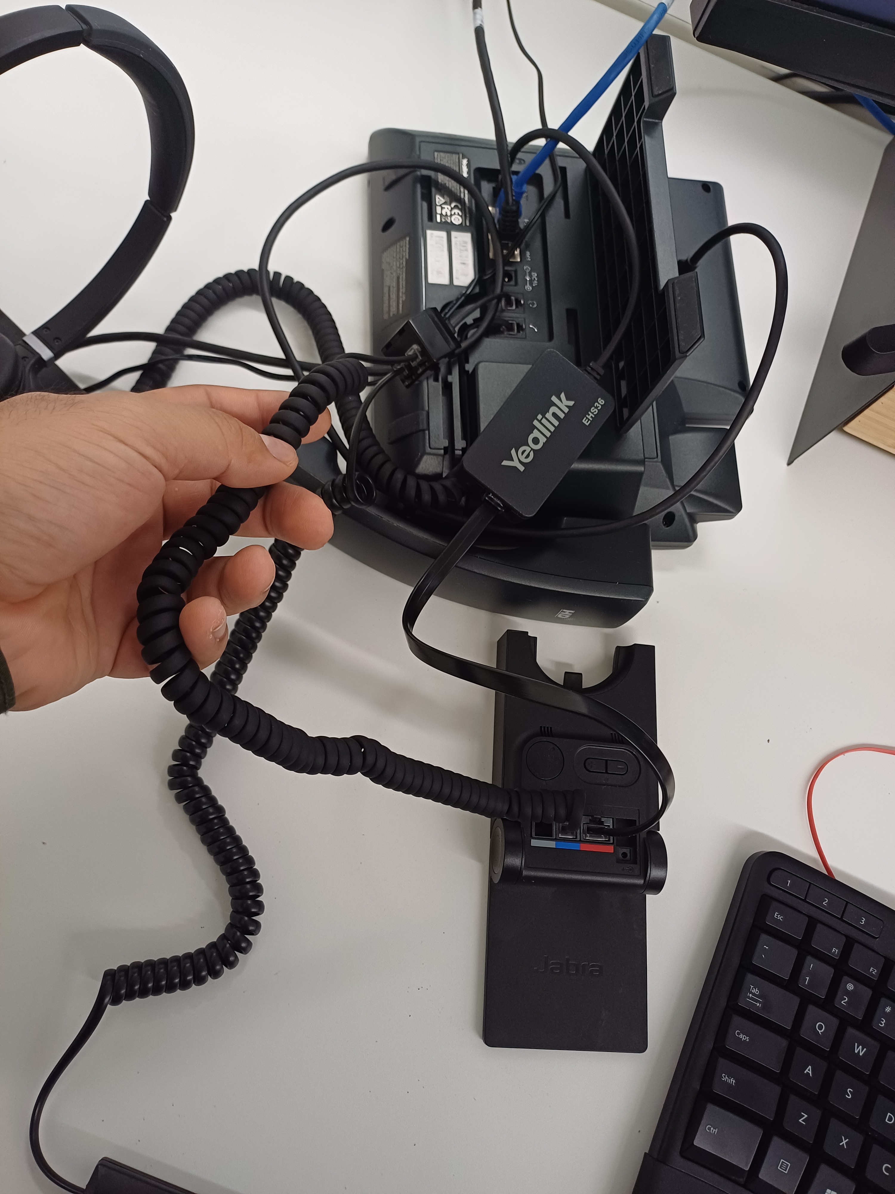 koppel de tweede splitter met de poort van het toestel en deze gaat in de blauwe poort van de Jabra