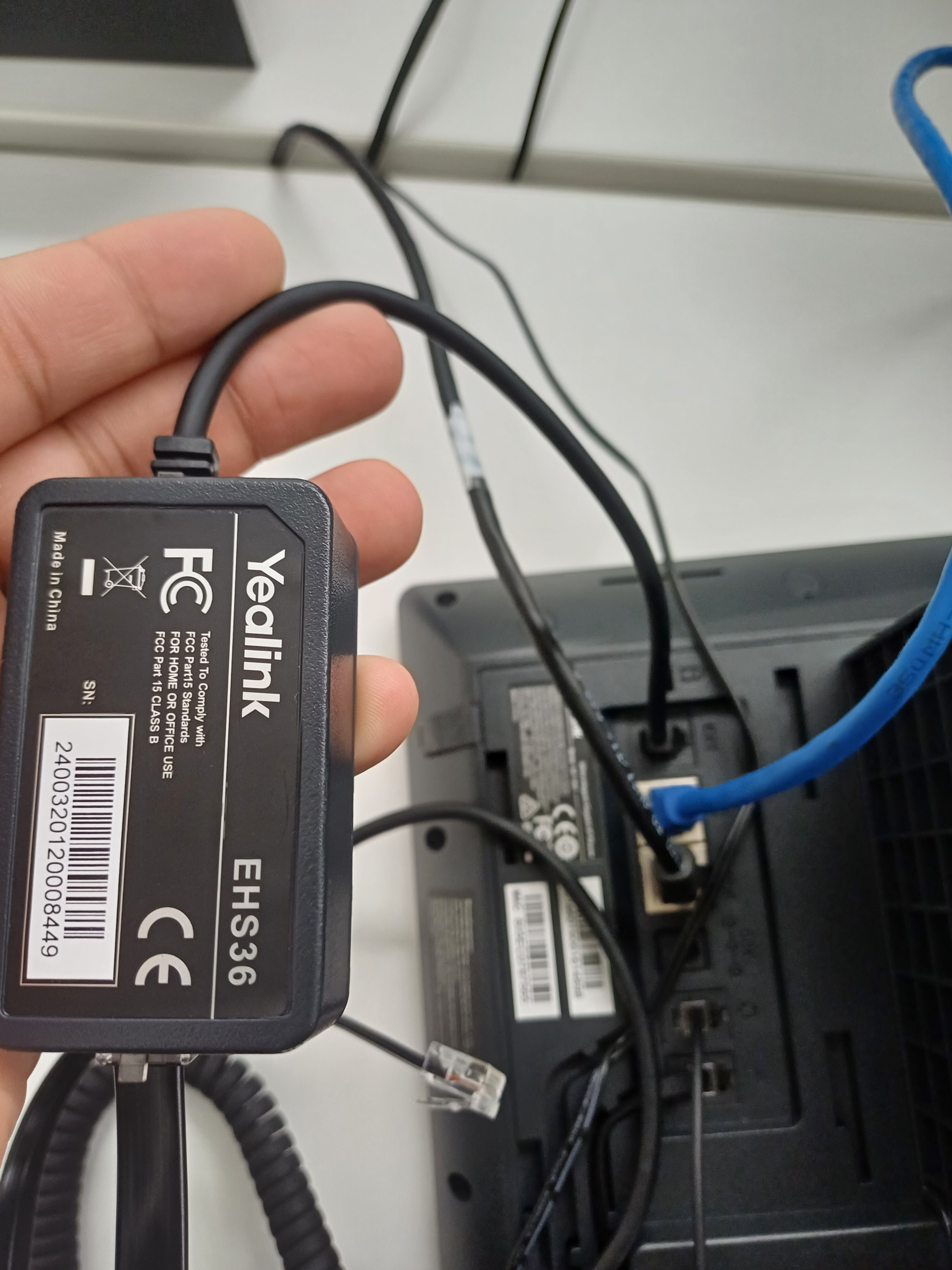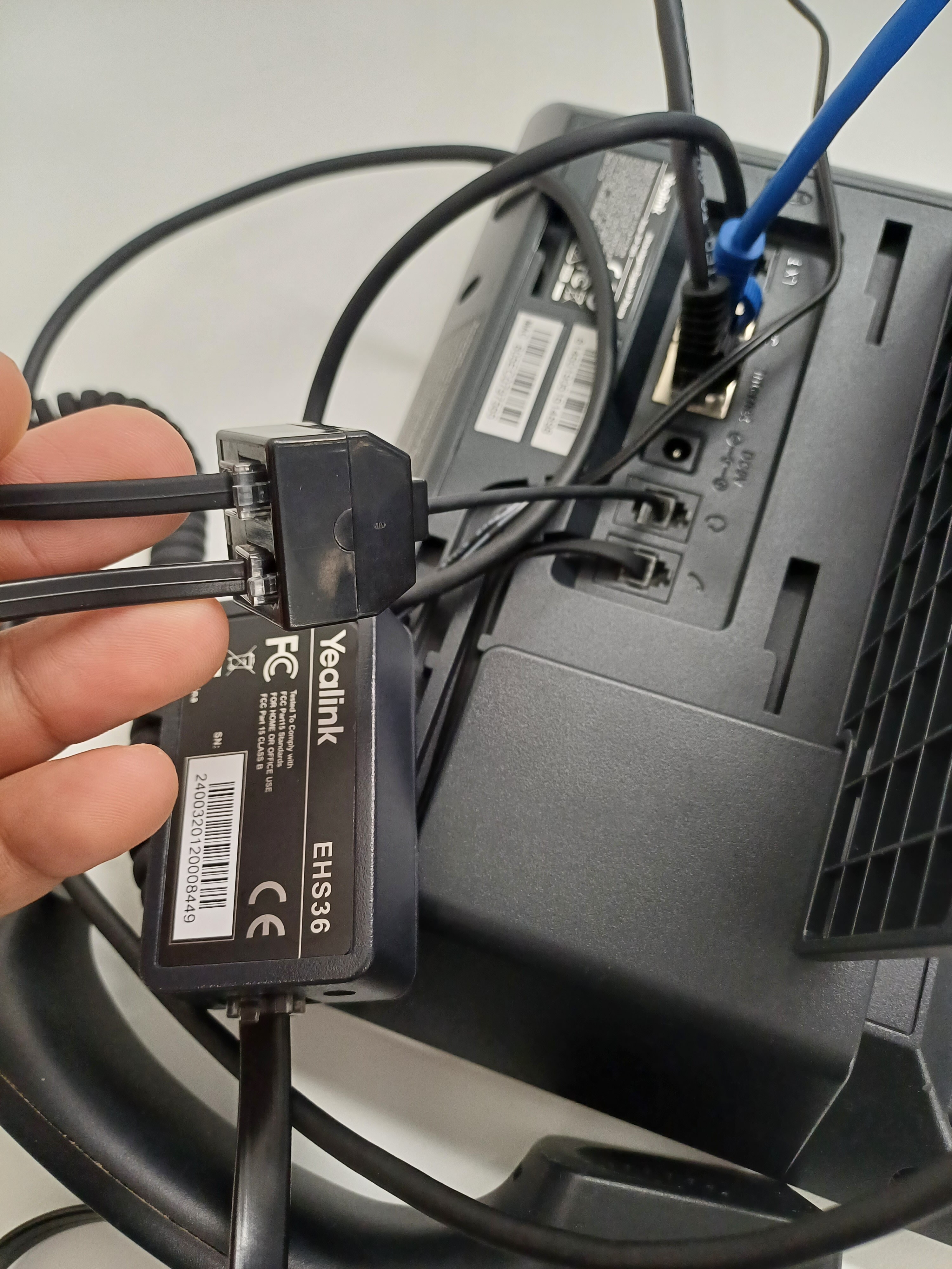 Koppel de EHS36s met de kleine kabel. Let op de RJ 9 gaat het toestel in en de Rj 45 de plitter in: