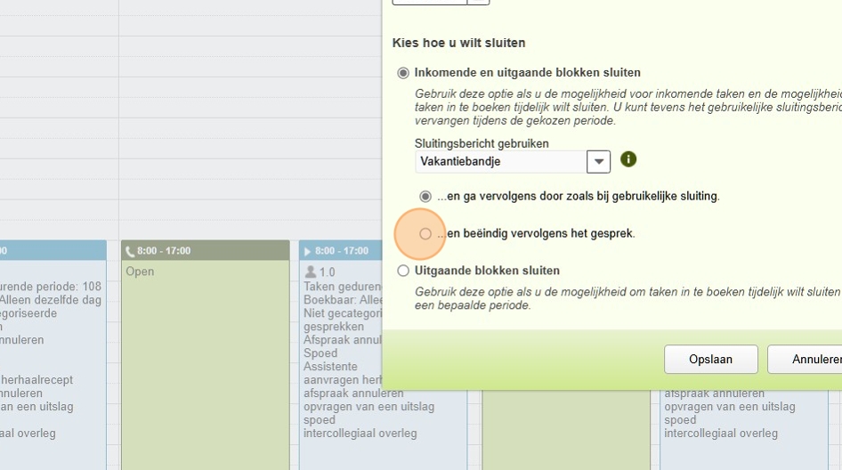 Bij sluiting van de praktijk, bijvoorbeeld met vakantie, kan er een bandje ingesteld worden. Dit bandje overruled de normale keuzemenu’s.